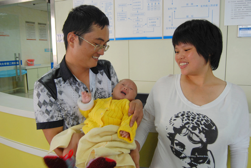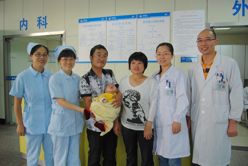 今年6月25日夜里,急診科來了一名從高郵趕到南京看病的25歲孕婦小英。她被家人送來時,已經懷孕32周,但是脾氣暴躁,一直抱著腦袋喊頭疼。急診科吳晉副主任為她做檢查,發現她頸項強直,兩只眼睛上下能動,卻不能外展和內收,腰椎穿刺顯示細胞數增高,提示有中樞系統感染,診斷為化膿性腦膜腦炎。 夫妻倆非常著急,這是他們結婚5年好不容易懷上的第一個孩子。如果現在流掉,不僅是對大人是很大的傷害,而且很難保證再懷上。如果治療,那又會對寶寶產生不良影響,生下來是否健康很難預料。小英的丈夫提出來,能否施行破腹產,醫生告訴他,這樣胎兒的危險性極高,有發生窒息、缺血血氧性腦病的可能。在小兩口左右為難的情況下,吳主任召集全院會診。經過婦產科、兒科、神經內科、消化科會診后,醫生給出了一套保住大人,盡量減少對胎兒藥物影響的治療方案。每天對胎兒進行監測,隨時調整用藥方案,醫生們想了很多辦法。護士們也盡量開導他們,減少他們的思想負擔。幾天后小英頭痛明顯得到好轉??墒牵觳凰烊嗽?,就在小英顱腦CT檢查時,顯示她右側腦室、枕葉有占位且腦室有積血。小英又轉到了腦外科接受進一步的治療。住進腦外科的第6天晚上,小英開始腹脹,下體見紅伴有液體流出,她被連夜送到了薩家灣院區產科。產科診斷她是胎膜早破,小寶寶開始不安分的想出來了。這個時刻是所有醫護人員最緊張的時刻。孩子不能有事!大人不能有事!大家只有這一個信念。7月17日,小英順利生下一個女寶寶,母女平安! 9月24日,當吳主任看到一對小夫妻懷里抱著一個白白胖胖的寶寶出現在急診大廳時,一眼就認出來這是三個月前來就診的小英。原來這次夫婦帶著寶寶特地從老家趕來南京,他們除了要給小英腦部做復查,還有一個更重要的目的,就是要當面向當初搶救了她們母女的醫護人員表示感謝。小英夫婦之前一直愁眉苦臉悶悶不樂,小英還會因為病情而發脾氣,但是這次卻一直抱著孩子害羞的笑著。夫妻倆說:“我們母女平安不是老天保佑來的,而是你們醫生護士為我們爭取來的。急診科、腦外科、產科還有那些來為我們看過病的醫生,照顧我們的護士……有太多太多的人要感謝。”而這一刻,小英一家三口的笑容就是對醫護人員最大的感謝。
