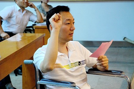 ? ?骨科袁同洲醫(yī)生坐著輪椅趕到會(huì)場(chǎng)參加新黨員宣誓 ?