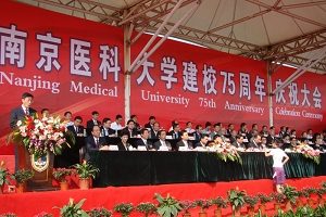 ? 2009年10月10日,秋風(fēng)送爽,陽光明媚,南京醫(yī)科大學(xué)迎來了她七十五周歲的生日,學(xué)校的領(lǐng)導(dǎo)、老師、同學(xué)們?yōu)樗e行了一場熱烈的慶祝活動。校慶活動在江寧校區(qū)的體育場上舉行,由南京醫(yī)科大學(xué)黨委書記陳國鈞主持,到會的嘉賓有原江蘇省委副書記、江蘇省政協(xié)副主席、現(xiàn)任南京醫(yī)科大學(xué)董事會董事長任彥申,江蘇省衛(wèi)生廳廳長郭興華,江蘇省教育廳副廳長丁曉昌,江蘇省科技廳副廳長夏冰,全體校領(lǐng)導(dǎo)以及學(xué)校老領(lǐng)導(dǎo)代表、校董事會成員代表、海內(nèi)外各界校友代表、各附屬醫(yī)院領(lǐng)導(dǎo),江寧區(qū)人民政府、江寧科學(xué)園管委會領(lǐng)導(dǎo)等,參加大會的還有各學(xué)院教師、學(xué)生、學(xué)校員工等。會上,陳琪校長、學(xué)生代表、教師代表、校友代表及校董事會董事長任彥申、省教育廳副廳長丁曉昌相繼發(fā)言講話。 我們南醫(yī)二附院作為南醫(yī)大的附屬醫(yī)院也派出了教師、醫(yī)生、學(xué)生等五十多人參加了慶祝大會,共同祝愿學(xué)校今后蓬勃發(fā)展、更加輝煌。 當(dāng)天下午在江寧校區(qū)的圖書館五樓報告廳舉行了學(xué)科建設(shè)與發(fā)展戰(zhàn)略2009院長論壇,附屬醫(yī)院的院長、黨委書記和部分學(xué)院的院長在論壇上做了認(rèn)真而深刻的報告。作為南京醫(yī)科大學(xué)第二附屬醫(yī)院即南京醫(yī)科大學(xué)第二臨床醫(yī)學(xué)院的帶頭人——魯翔院長也作了題為《第二臨床醫(yī)學(xué)院學(xué)科建設(shè)的思考》的報告。論壇圍繞著學(xué)校的學(xué)科建設(shè)與發(fā)展戰(zhàn)略這一主題舉行,為學(xué)校各學(xué)院、附屬醫(yī)院方面做出了總結(jié)和規(guī)劃。 最后,南京醫(yī)科大學(xué)七十五周年校慶活動在文藝晚會音樂聲中落下帷幕。 ?
