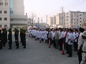 齊心攜手? 攀登新高峰! ——國慶59周年升旗儀式寫真 ? 10月1日早晨7點10分,我院在門診樓前的廣場上舉行了莊嚴隆重的升旗儀式。雖是在假日中,醫院全體中層干部都早早到達現場,還有部分離退休老干部、老職工以及在崗的醫護人員、住院的部分患者和家屬都參加了升旗儀式。 7點10分整,院黨委副書記周鳴宣布升旗儀式開始,醫院儀仗隊的年輕姑娘小伙們身著威武的禮服、邁著整齊有力的步伐,精神抖擻進入儀式現場,當莊嚴的國歌聲響起的時候,五星紅旗緩緩上升,在藍天的映襯下顯得更外的鮮艷……大家仰望紅旗、肅然起敬;撫今追昔,心潮難平:今年是我們偉大的祖國建國59周年,也是改革開放整整30周年,又恰逢百年難遇的北京奧運。我們的祖國從來沒有像今天這樣的美好、這樣的繁榮富強,大家的心情格外的激動、情緒格外的高漲。 南醫大黨委陳國鈞書記親臨我院的升旗儀式現場,來自于上級領導的關愛和支持令全院干部職工精神大振,陳書記語重心長的講話中既有對我們二附院近年來工作的肯定,又有著對醫院今后不斷發展的期盼。魯翔院長最后的總結講話充滿了激情,他號召全院干部職工要齊心攜手、再接再厲,不斷攀登新的高峰;要以全新的精神面貌迎接新一輪的挑戰,使我們二附院成為名副其實的三級甲等現代化教學醫院!魯院長的講話深深激起了全體干部職工內心的共鳴:每一個二附院人都深感從來沒有像今天這樣意氣風發、斗志昂揚!我們有信心、有決心,百尺竿頭更上一層! ?