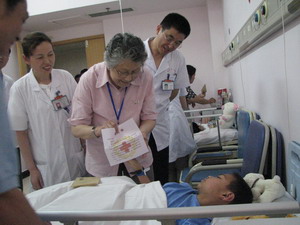 省紅會吳錫軍會長 南醫大二附院慰問災區傷員 ? 今天下午3時,江蘇省紅十字會吳錫軍會長、常務副會長劉洪祺、副會長兼黨組書記張立民冒雨前往南醫大二附院看望了四川災區的傷員。 在南醫大二附院愛心病區,吳錫軍會長逐一看望了22位傷員,并給傷員們發了慰問信和現金,她鼓勵傷員們要戰勝傷痛,盡快康復,回去重建美好的家園。吳會長對傷員們說:江蘇是一個很美的地方,江蘇人民是真誠好客的,江蘇的醫生會為他們提供最好的技術和最盡心的服務。希望他們放心、安心。 吳錫軍會長對二附院愛心病房溫馨的環境大加贊揚,對病區醫務人員的工作也給予了很高的評價,夸獎他們的服務非常周到、貼心。最后吳錫軍會長一行與二附院愛心病區的工作人員合影留念。 ?
