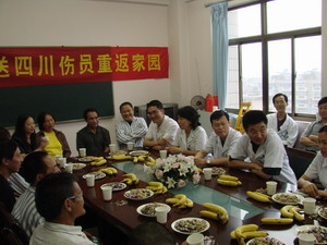 我院隆重歡送首批11位痊愈傷員重返家園 ???? 6月17日下午,我院在愛心病區舉行了歡送首批痊愈傷員重返家園座談會,魯翔院長、汪寶林副院長、大外科主任、書記,院工會負責人出席了歡送會。 魯翔院長在歡送會上發表了真情洋溢的講話,他說:這次,災區傷員們來到我院,把我院也變成了抗震救災的前線,給了我們全院醫護人員一個為災區人民做貢獻的機會,同時也是對我們醫護人員的一次考驗??简灻媲?,我們取得了勝利,大家順利康復,平安出院了。民間常說:大難不死,必有后福,能與各位傷員在南京相識相處是我們之間的緣分,希望大家常回來看看,像走親戚一樣把我們之間的情誼延續下去,直到永遠。 作為赴川抗震救災醫療隊的隊長,汪寶林副院長在講話中盛贊了四川人民的淳樸、勇敢、善良和堅強,他衷心祝愿傷員們返川后能盡快地重建美麗的家園,過上平安幸福的生活。 即將重返家園的傷員們難掩喜氣和歸心似箭的心情,可眼角的淚花卻又透露出他們對南京、對二附院、對醫生護士們的戀戀不舍,他們由衷地感謝黨和政府,感謝江蘇人民,感謝二附院的領導,感謝悉心治療和精心照顧他們的愛心病區的每一位醫護人員,他們表示,以后一定還會再來江蘇,再來看望二附院的親人! ?