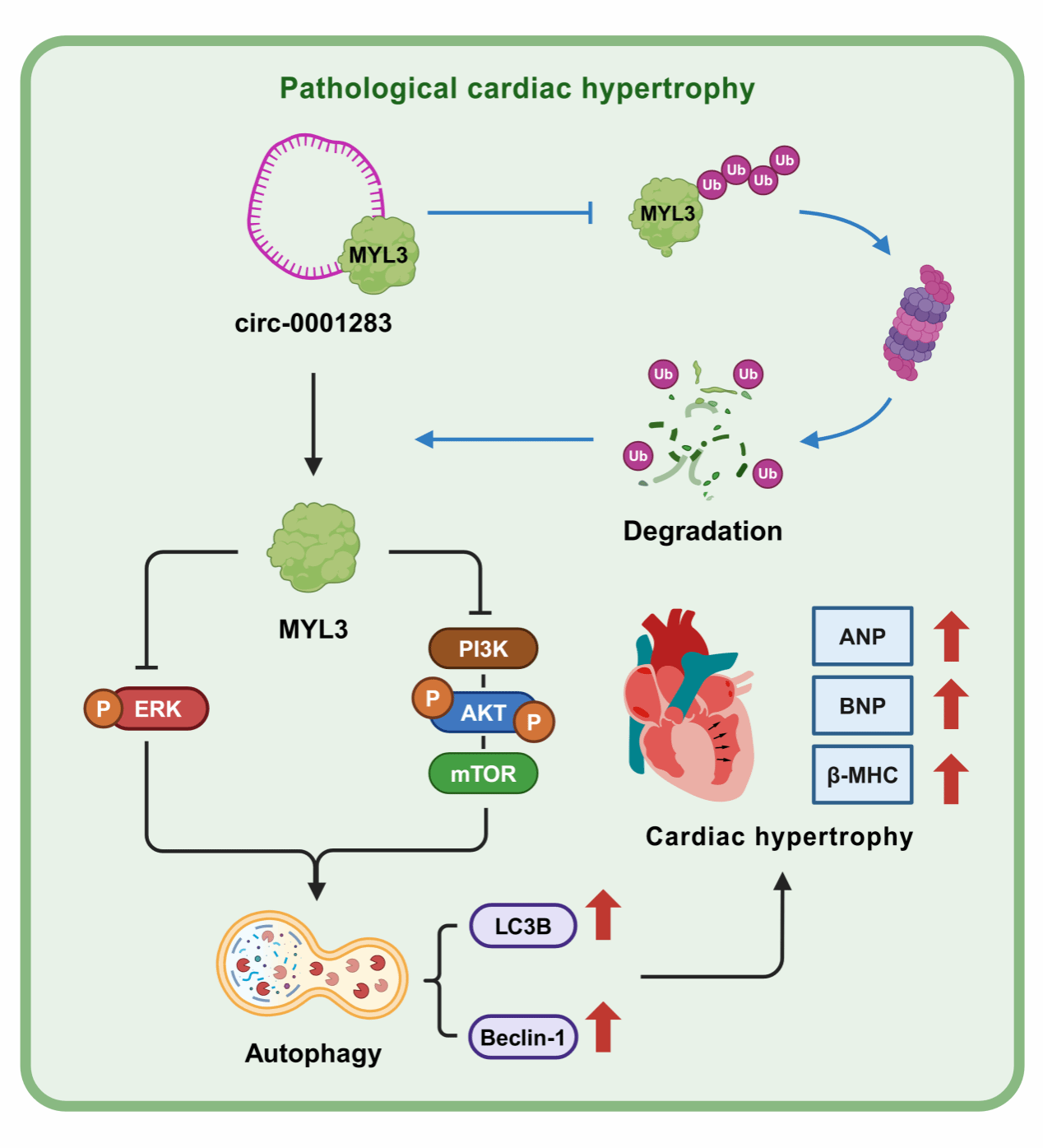 研究團隊在國際上首次發現一種名為circ-0001283的環狀RNA,該環狀RNA在心肌肥厚過程中表達顯著上調,通過與MYL3結合,降低MYL3蛋白的泛素化水平,從而上調MYL3蛋白表達。MYL3進一步調節PI3K/Akt/mTOR和ERK信號通路,促進細胞自噬,最終加重心肌肥厚。 本研究不僅提出circ-0001283與MYL3蛋白相互作用調控心肌肥厚的新機制,也強調了circ-0001283在心肌肥厚過程中的重要性,為開發靶向circ-0001283的治療方案奠定了理論基礎。