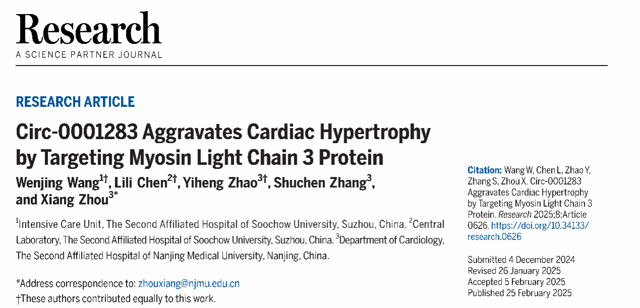 近日,我院周祥教授團隊在中科院一區雜志《Research》發表題為 “Circ-0001283 Aggravates Cardiac Hypertrophy by Targeting Myosin Light Chain 3 Protein”的研究論文。該研究揭示了環狀RNA circ-0001283作為心肌肥厚的潛在治療靶點,能為緩解心肌肥厚提供新思路。